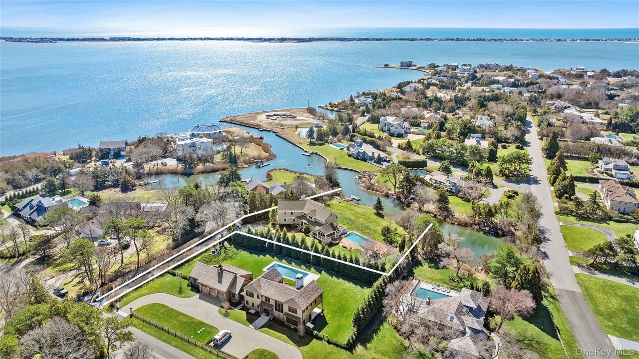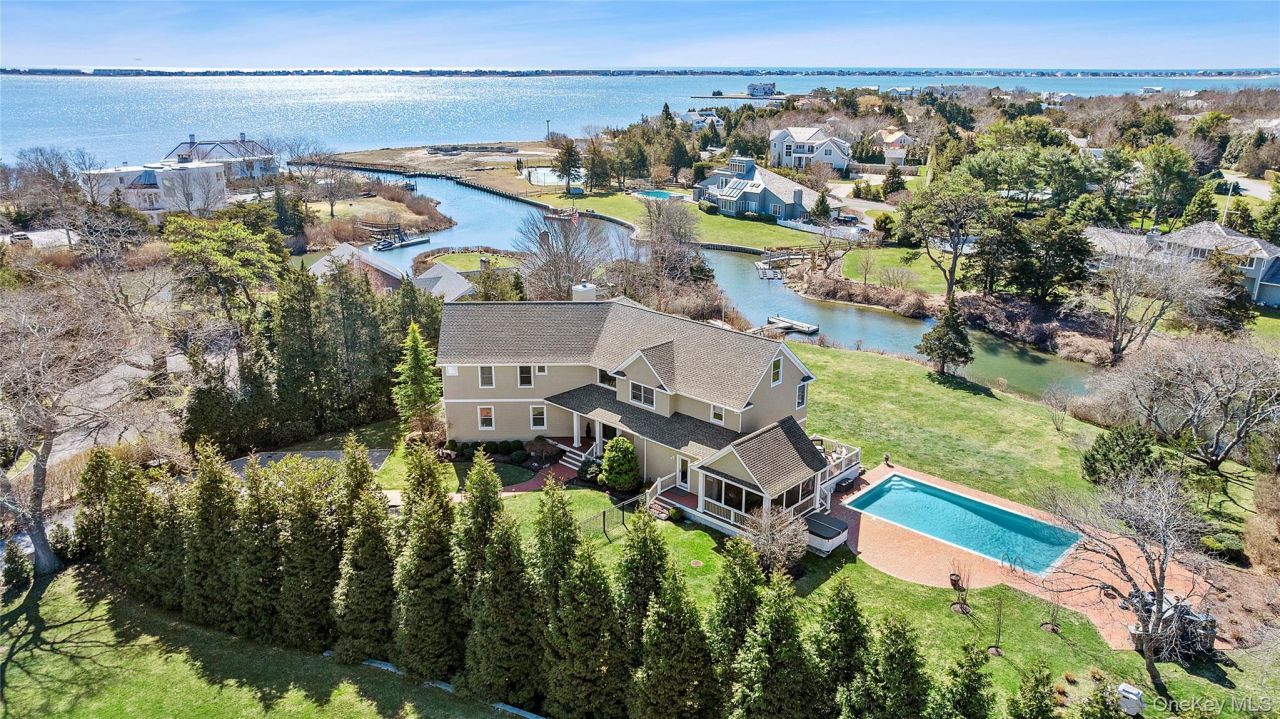 Set on 1.15 acres along a tranquil canal with direct access to Moriches Bay, this beautifully appointed waterfront residence offers the perfect blend of boating lifestyle and relaxed Hamptons living. With a private dock ideal for a boat or jet ski and peaceful water views throughout the property, the home is designed to fully embrace its exceptional setting. Inside, the custom post-modern residence features four bedrooms and three-and-a-half baths, with expansive living spaces thoughtfully arranged for both comfort and entertaining. The main level includes a sun-filled great room with a wood-burning fireplace, a spacious living room with gas fireplace, and dining room adjoining the kitchen. Large sliding glass doors throughout the first floor capture natural light and open seamlessly to the deck and waterside grounds. The recently renovated kitchen is designed for gathering, featuring a generous center island with seating, stainless steel appliances including a Viking range, dining area, and a wet bar complete with wine refrigerator and rack. Hardwood floors, custom millwork, and oversized crown moldings add warmth and character throughout the home. Upstairs, the generously sized primary suite offers a private retreat overlooking the water, complete with a walk-in closet, gas fireplace, and a balcony perfectly positioned to take in the peaceful canal views. The en-suite bath features a double vanity, soaking tub, and separate shower, along with an additional balcony overlooking the water. The second floor also includes a guest suite with full bath, two additional bedrooms with a shared hall bath, an office or sitting area, and a convenient laundry room. Outdoors, the property transforms into a true oasis. The expansive grounds feature a heated gunite pool, outdoor fireplace and pizza oven, and a screened porch ideal for summer evenings by the water. With its private dock and easy access to Moriches Bay, the property offers an exceptional opportunity to enjoy boating, paddleboarding, and the serene beauty of Remsenburg's waterfront lifestyle.